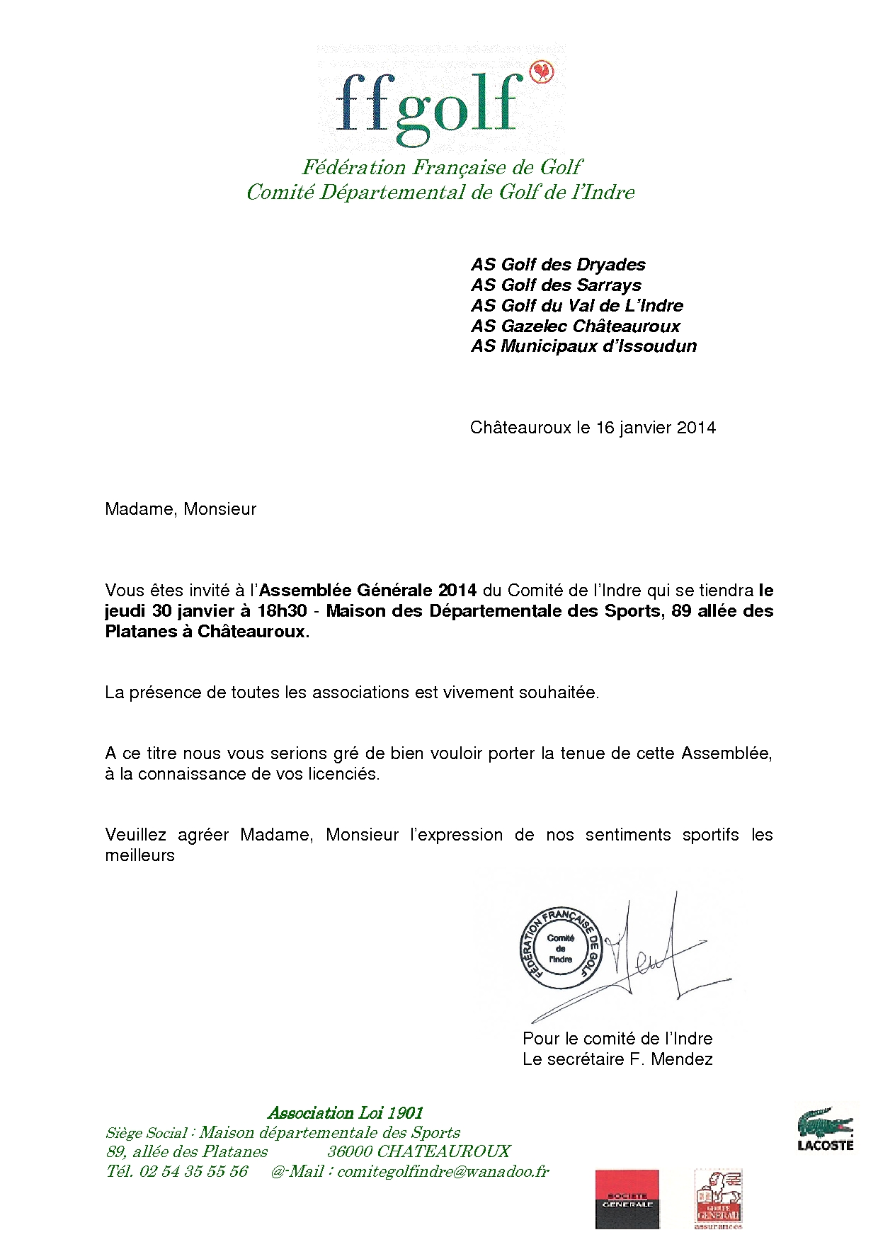 Les licenciés du Val de l’Indre et les membres de l’AS sont conviés à l a réunion du comité de l’Indre de Golf qui se réunira:
