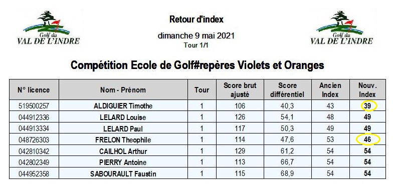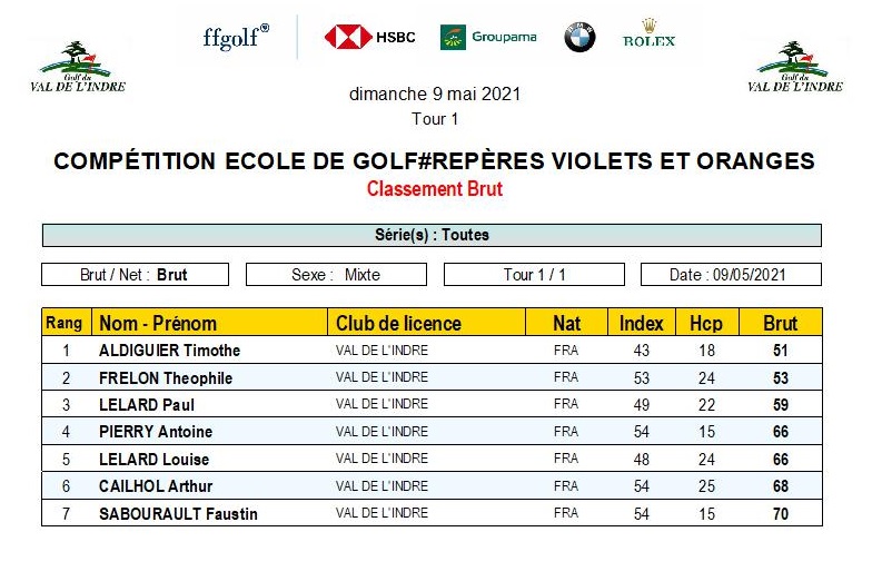 Compétition Ecole de Golf – Repères Violets et Oranges -9 mai 2021