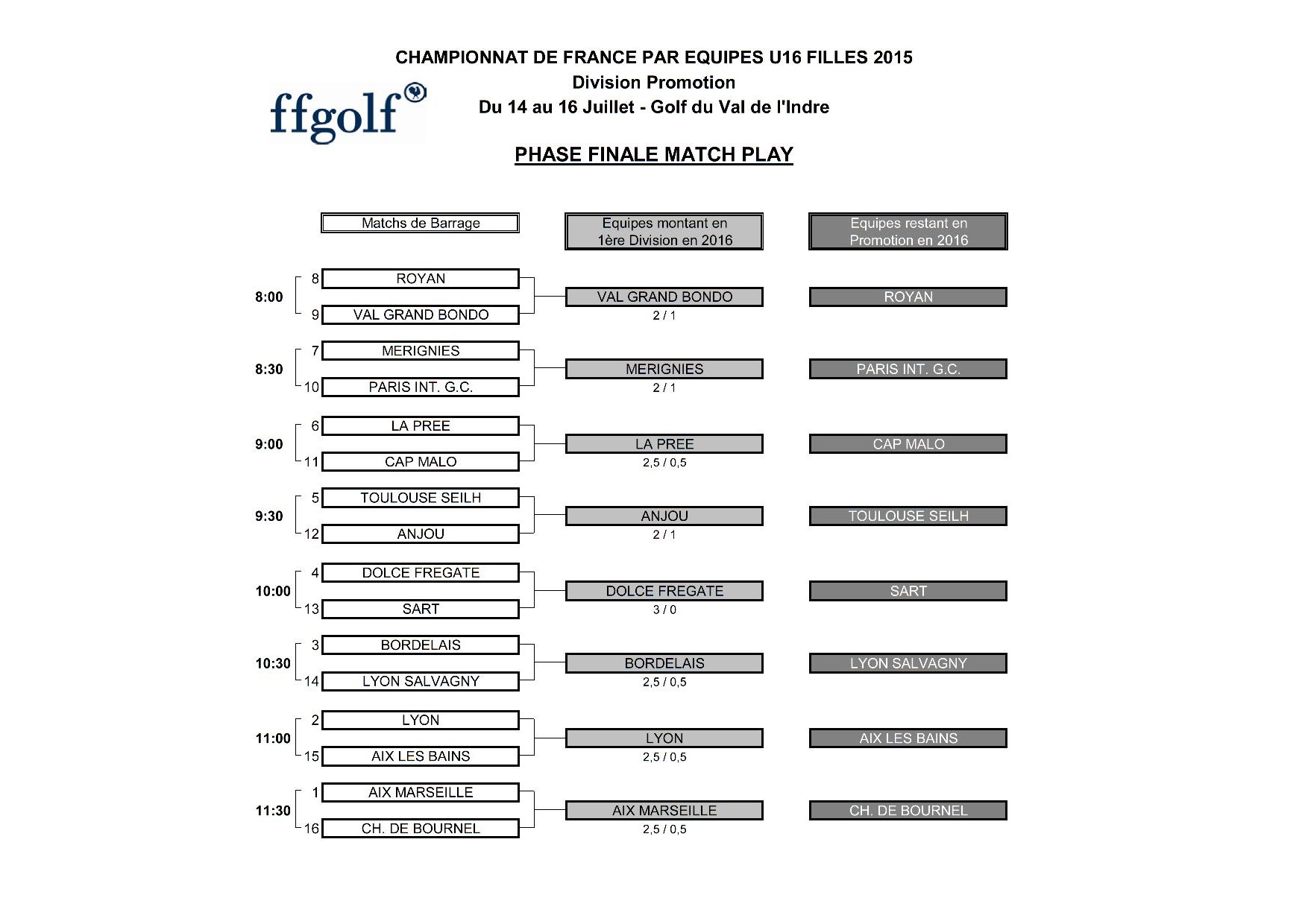 Calendrier – Heures de départ – Résultats des compétitions